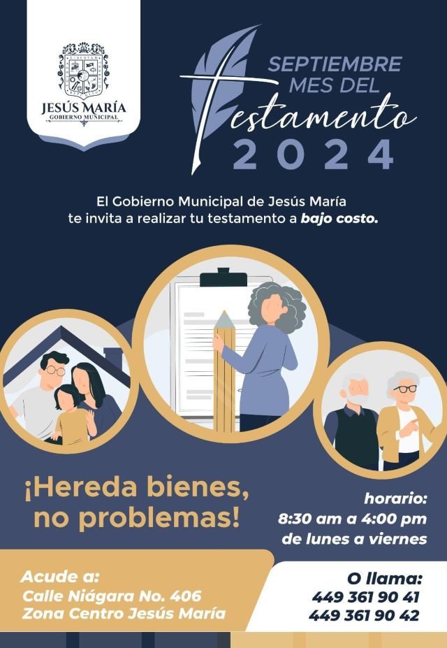 JESÚS MARÍA, AGS.- El Gobierno Municipal de Jesús María invita a la ciudadanía en general a realizar su testamento durante el mes de septiembre, Mes del Testamento, y así aprovechar que el trámite puede realizarse a un menor costo, dando de esta forma certidumbre y seguridad al patrimonio familiar.
