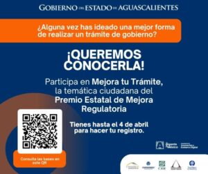 - Las y los interesados tienen hasta el 4 de abril para registrarse en el portal https://premiomejoraregulatoria.aguascalientes.gob.mx/premioMR/