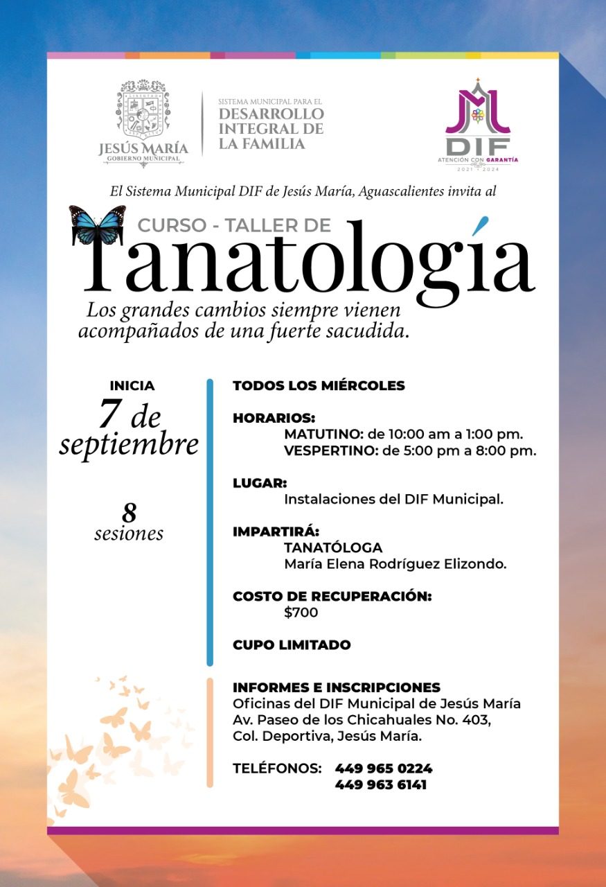 JESÚS MARÍA, AGS.- El DIF Municipal de Jesús María invita a la población que así lo desee al Curso Taller de Tanatología, ello con el objetivo de seguir impulsando el bienestar de las personas que han sufrido alguna pérdida.