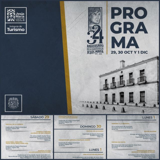JESÚS MARÍA, AGS.- Con motivo del 324 aniversario de la fundación de Jesús María, el Gobierno Municipal, a través de la Instancia de Turismo, dio a conocer el programa de actividades para los días 29 y 30 de noviembre, así como el 1 de diciembre, fecha oficial de aniversario.