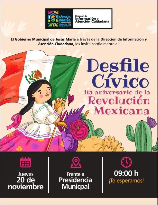 El Gobierno Municipal de Jesús María, a través de la Dirección de Información y Atención Ciudadana, invita a la población a disfrutar de esta conmemoración en la que participarán academias deportivas, charros y escaramuzas, diversas instituciones educativas, entre otros contingentes.