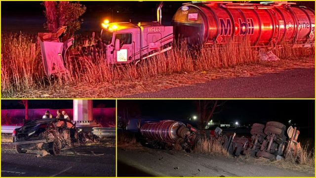 Su coche quedó destrozado por completo y el segundo remolque del camión de carga terminó volcado fuera de la cinta asfáltica y presentó derrame del combustible que transportaba, que fue contenido por elementos del Departamento de Bomberos Municipales.