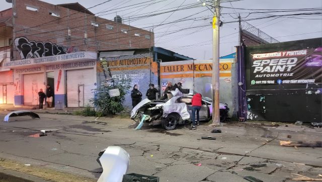 El automóvil salió de la cinta asfáltica hacia la lateral, derribó un poste de madera y posteriormente se estrelló contra el portón y la fachada de un taller mecánico.