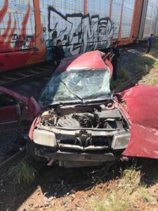 En el número de emergencia 911 se recibió el reporte de que sobre la carretera estatal número 90, a la altura de la entrada al ITPA, se había registrado un accidente en el que un automóvil que había intentado ganarle el paso al tren, había sido impactado por la pesada unidad.