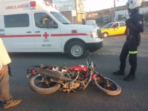 LAGOS DE MORENO, JAL.- Un joven resultó lesionado tras derrapar y caer de la motocicleta que conducía debido a que fue encandilado por el sol.