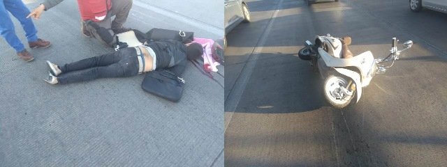 Enseguida, el joven cayó a la cinta asfáltica y se golpeó fuertemente, mientras que su unidad de motor se arrastró alrededor de 62 metros.