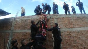 Los policías del grupo GOES detectaron sobre la misma calle San José a una persona del sexo masculino, el cual llevaba 5 casetones de polietileno para construcción y al ver la presencia policial se dio a la fuga y al momento de interceptarlo para lograr su detención, el individuo se puso agresivo sacando una navaja de entre sus prendas, lesionando uno de los oficiales en la mano, para posteriormente darse a la fuga corriendo sobre la acera, por lo que de inmediato los policías fueron en su persecución, al verse acorralado el sujeto subió a las azoteas de los domicilios.
