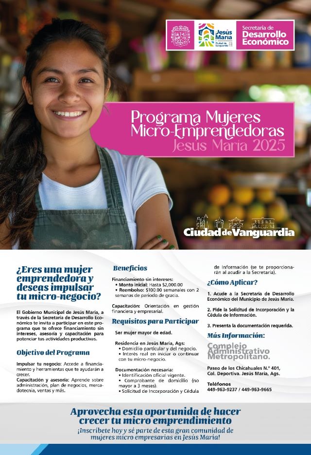 JESÚS MARÍA, AGS.- Con la finalidad de impulsar a las mujeres y brindarles herramientas para el desarrollo de sus micronegocios, el Gobierno Municipal de Jesús María, a través de la Secretaría de Desarrollo Económico, abre convocatoria para el programa “Mujeres Micro emprendedoras 2025”.