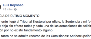 Aquí el texto de su publicación: Finalmente llegó al Tribunal Electoral por oficio, la Sentencia a mi favor por lo que deja sin efecto todas y cada una de las actuaciones de solicitud de sanción por no existir fundamento alguno.