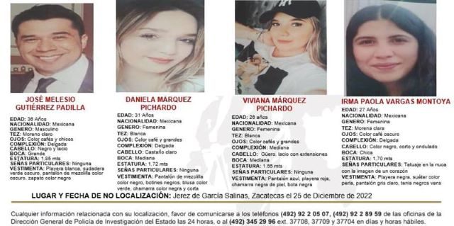 Sin embargo, hasta el momento no han sido localizados los desaparecidos, las hermanas Daniela y Viviana Márquez Pichardo, de 31 y 26 años, respectivamente, su prima Irma Paola Vargas Montoya, de 27, y José Melesio Gutiérrez Padilla, de 36 años, novio de Daniela, todos ellos originarios de Colotlán, Jalisco.