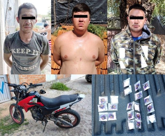 CALVILLO, AGS.- Efectivos del Ejército Mexicano detuvieron a tres sujetos, presuntos vendedores de drogas, y les aseguraron 20 envoltorios con “crystal” así como una motocicleta.