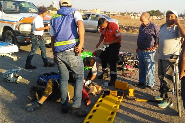 LAGOS DE MORENO, JAL.- Con lesiones de consideración resultó un joven motociclista tras chocar contra camioneta.
