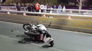 AGUASCALIENTES, AGS.- Un motociclista, al parecer cobrador de la empresa Elektra, falleció tras de que se accidentó en el Puente Bicentenario, donde se impactó contra la guarnición del camellón central y después contra el muro de contención con barrera metálica.