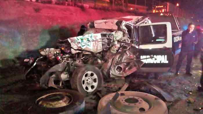 AGUASCALIENTES, AGS.- Tres elementos del Grupo de Operaciones Especiales (GOES) pierden la vida en accidente automovilístico en Avenida Siglo XXI a la altura del Fraccionamiento Pintores Mexicanos luego de impactarse a toda velocidad en la parte posterior de un Torton previo al impacto iban en persecución de una camioneta color negro que conducía un ex policía, que se había negado a pagar la cuenta en un antro.