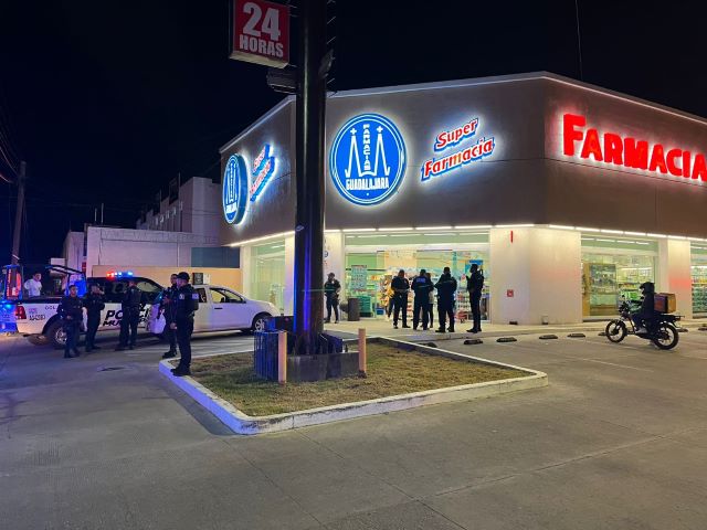 El robo con violencia fue reportado a los servicios de emergencia y oficiales de Seguridad Pública Municipal y Estatal se trasladaron a la farmacia para tomar cartas en el asunto.
