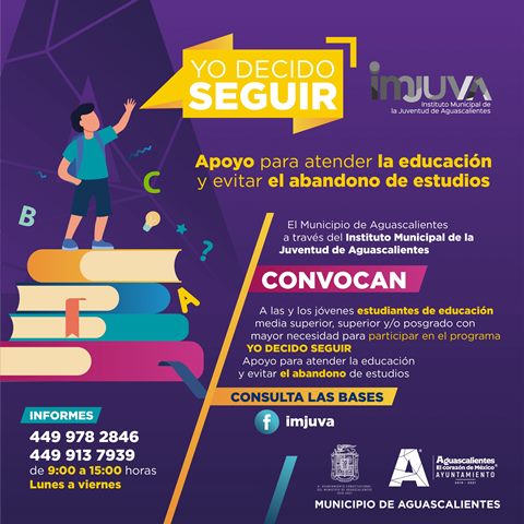 AGUASCALIENTES, AGS.- El Ayuntamiento capitalino, a través del Instituto Municipal de la Juventud (IMJUVA), lanza la convocatoria “Yo Decido Seguir”, a través de la cual se entregarán 650 becas para que jóvenes puedan continuar con sus estudios de educación media superior, superior y/o posgrado.