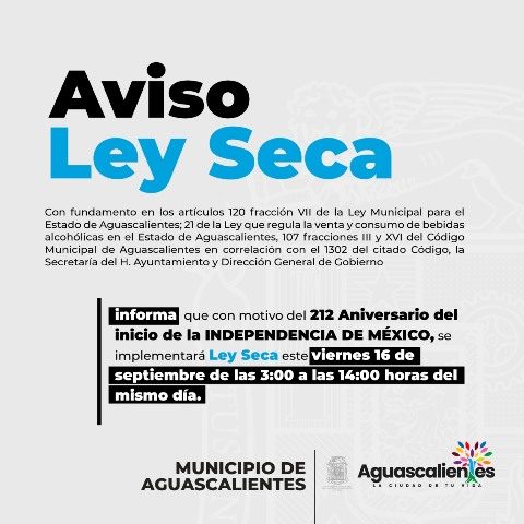 AGUASCALIENTES, AGS.- El secretario del Ayuntamiento y director general de Gobierno del Municipio de Aguascalientes, Jaime Beltrán Martínez, informa que con motivo del CCXII Aniversario del inicio de la Independencia de México, se implementará Ley Seca el viernes 16 de septiembre del año 2022, de las 03:00 a las 14:00 horas del mismo día.