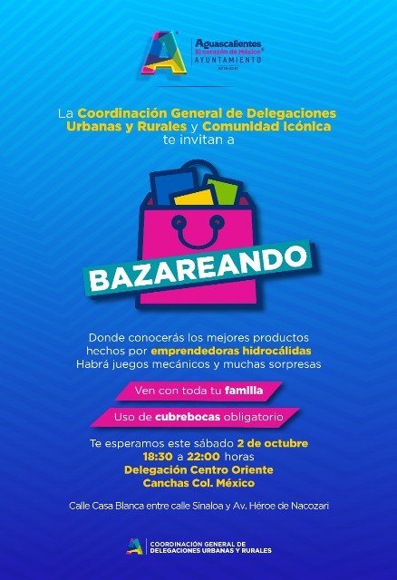 AGUASCALIENTES, AGS.- El Municipio de Aguascalientes, en alianza con Icónica Comunidad, lleva a cabo el programa “Bazareando”, a través del cual se brindan en las diferentes Delegaciones de la capital espacios para promover las ventas, la reactivación económica y el desarrollo de mujeres emprendedoras.