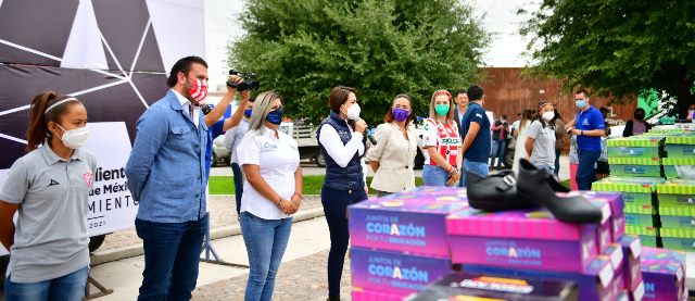 AGUASCALIENTES, AGS.- En alianza con el Club Necaxa y la empresa SISOLAR, la alcaldesa de Aguascalientes, Tere Jiménez, entregó 400 pares de calzado escolar a niñas y niños del oriente de la ciudad, brindándoles los medios para que regresen a la escuela y apoyando la economía de sus familias.