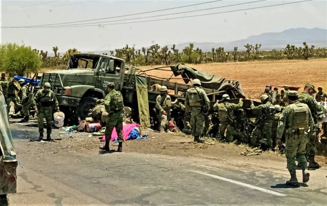 FRESNILLO, ZAC.- Un camión del Ejército Mexicano se volcó aparatosamente y dejó un saldo de tres militares muertos y 15 más lesionados que tuvieron que ser trasladados a recibir atención médica.