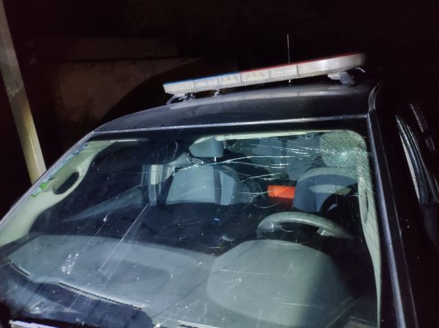 Fue en esos momentos que varios sujetos comenzaron a lanzarles objetos contundentes, provocando daños en la patrulla.