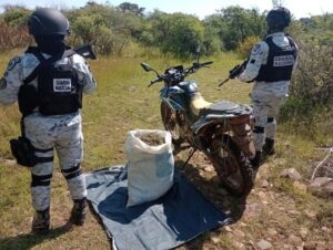 Previamente, cerca de las dos de la tarde del mismo sábado, en las inmediaciones del tramo carretero Moyahua, Mezquital del Oro, en el poblado Los Arroyos, personal militar aseguró una motocicleta con reporte de robo y un costal con marihuana de casi 14 kilos.