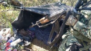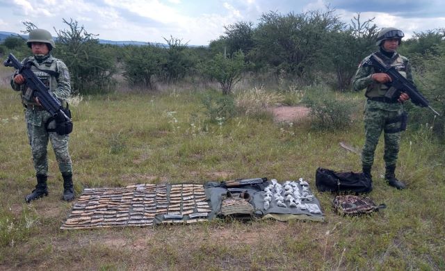 De esta manera, los soldados desarticularon un campamento clandestino y aseguraron un arma de fuego larga, tres cargadores de diversos calibres, mil 518 cartuchos de diversos calibres, un chaleco antibalas color café, dos placas metálicas y 25 bolsas con marihuana.
