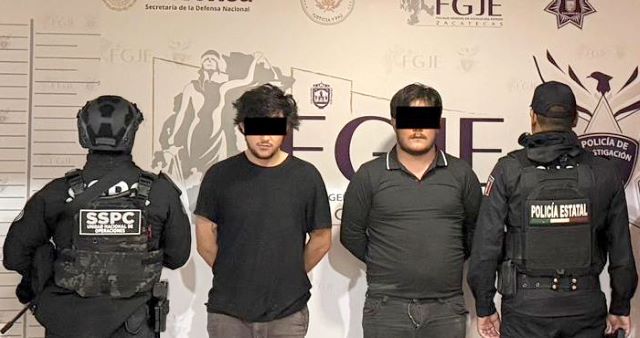 FRESNILLO, ZAC.- Elementos de Policía de Investigación, en coordinación con personal de la Secretaría de Seguridad y Protección Ciudadana (SSPC) del Gobierno de México, lograron la detención de Brandon “N” y Carlos “N”, sujetos señalados por amedrentar y amenazar a comerciantes de Fresnillo, esto con la finalidad de obtener un lucro de manera ilícita.