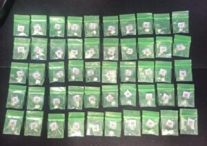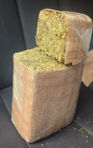 Por lo anterior, al realizar una inspección corporal preventiva y revisar el paquete de plástico se localizó un bloque con hierba verde seca con los características de lo que parecía ser marihuana prensada, envuelta en cinta canela con un peso aproximado de 750 gramos así como 50 envoltorios de plástico tipo ziploc que contenían lo que parecía ser sustancia granulada al parecer crystal, que sumaron aproximadamente 15 gramos.
