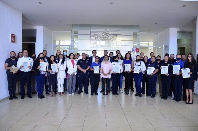 AGUASCALIENTES, AGS.- La tarde de este martes el presidente municipal Leonardo Montañez presidió la entrega de 40 certificados a policías y personal administrativo de la Secretaría de Seguridad Pública Municipal de Aguascalientes (SSPM) por haber acreditado el curso de capacitación «Atención presencial de primer contacto a víctimas de violencia de género».