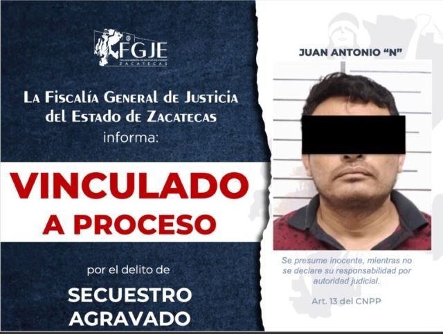 ZACATECAS, ZAC.- El equipo de investigación adscrito a la Fiscalía Especializada en Delitos de Alto Impacto logró la vinculación a proceso en contra de Juan Antonio “N” por el delito de secuestro agravado, como medida cautelar se dictó prisión preventiva y se establecieron cuatro meses de investigación complementaria.