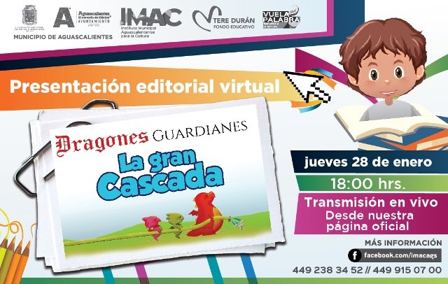 AGUASCALIENTES, AGS.- El Instituto Municipal Aguascalentense para la Cultura (IMAC), presentará de manera virtual el libro infantil “Dragones Guardianes, La Gran Cascada”, el cual aborda a través de historias divertidas temas importantes como el cuidado del agua, para crear conciencia en los pequeños lectores.