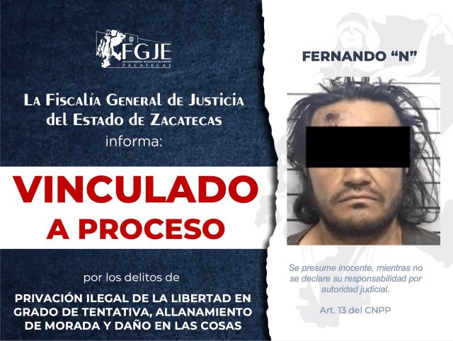 ZACATECAS, ZAC.- El equipo de investigación adscrito a la Fiscalía en combate a los delitos de alto impacto logró acreditar la probable participación y vinculación a proceso de Fernando “N” por los delitos de privación ilegal de la libertad en grado de tentativa, allanamiento de morada y daño en las cosas.