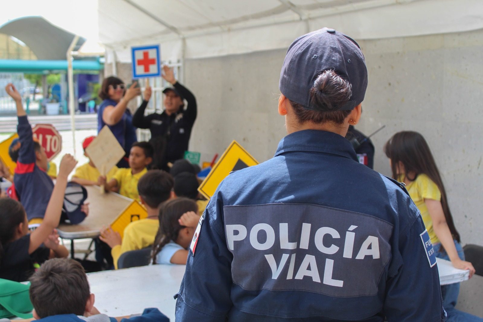 Como parte del programa “Retomemos nuestra cultura vial en Aguascalientes”, oficiales de la Policía Vial instruyen a las y los niños para que sepa distinguir los señalamientos preventivos, informativos y restrictivos, y además para que conozcan las figuras de autoridad y las leyes de vialidad.
