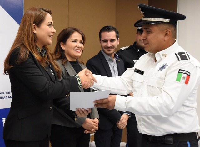 - La alcaldesa Tere Jiménez hizo entrega del Bono al Policía del Mes a tres elementos que demostraron su compromiso con la población de Aguascalientes