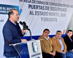 Por su parte, José de Jesús Altamira Acosta, Secretario de Obras Públicas, explicó que para la consolidación de las puertas de acceso y seguridad al estado se invirtieron más de 29 millones de pesos en acciones constructivas para dotar de casetas con cristales y puertas con blindaje categoría 4; parapetos en lugares estratégicos para resguardo del personal; cubiertas para revisiones de vehículos y transporte, áreas de descanso y servicios, entre otras.