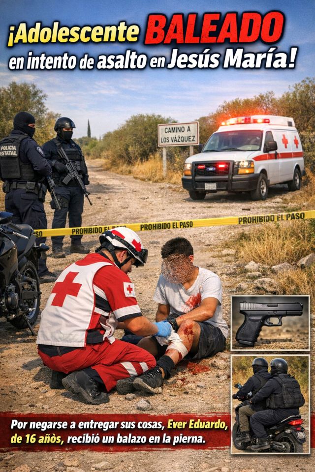 JESÚS MARÍA, AGS.- Un menor de edad resultó lesionado por proyectil de arma de fuego tras un intento de asalto ocurrido en un camino de terracería conocido como Los Vázquez, detrás del Parque Ecológico Los Cuartos.