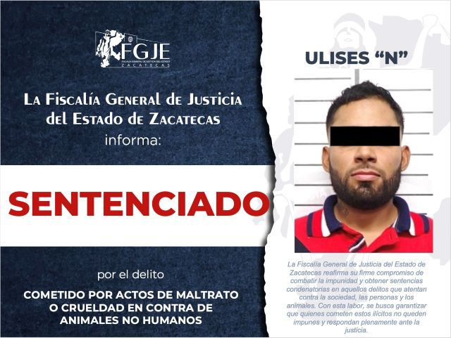 ZACATECAS, ZAC.- La Fiscalía Especializada en Atención de Delitos contra las Mujeres por Razones de Género obtuvo sentencia condenatoria en procedimiento abreviado en contra de Ulises “N” por el delito cometido por actos de maltrato o crueldad en contra de animales no humanos con una pena de 9 meses de prisión y multa.