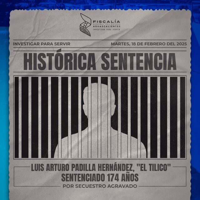 AGUASCALIENTES, AGS.- La Vicefiscalía Jurídica y de Litigación Penal obtuvo una significativa sentencia condenatoria de 174 años de prisión en contra de Luis Arturo Padilla Hernández alias “El Tilico”, quien resultó responsable del delito de privación ilegal de la libertad en su modalidad de secuestro agravado.