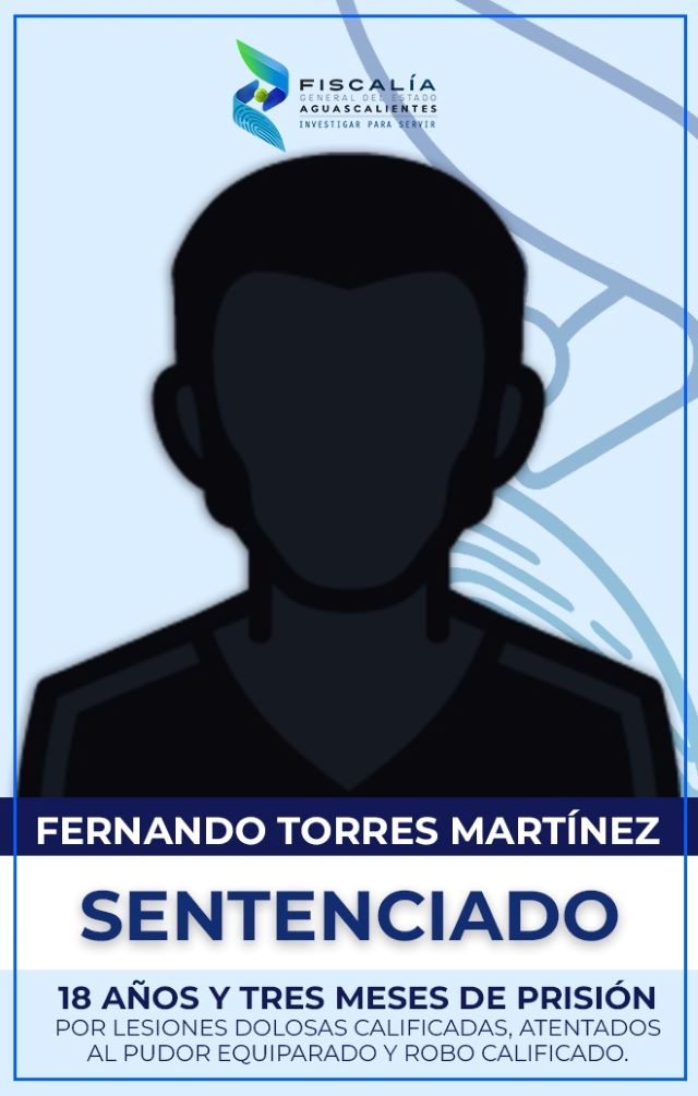 AGUASCALIENTES, AGS.- La Fiscalía General del Estado de Aguascalientes procuró y obtuvo justicia en una causa penal motivada por la comisión de los delitos de lesiones dolosas calificadas, atentados al pudor equiparado y robo calificado, en la que se señaló a Fernando Torres Martínez como responsable.