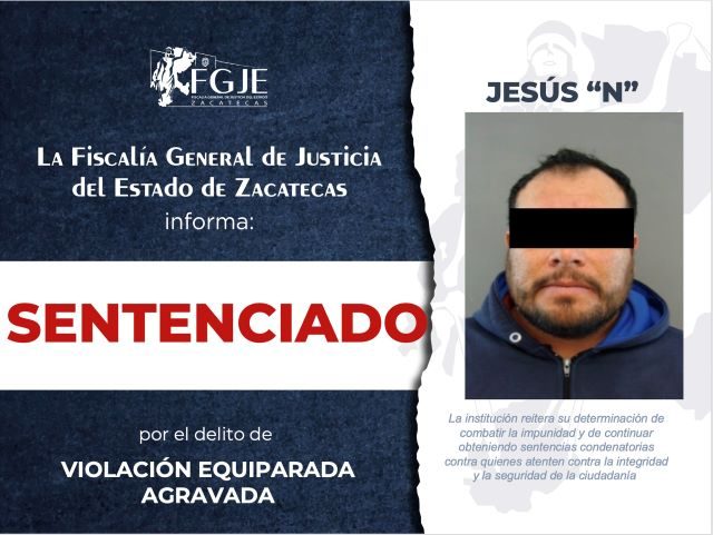 ZACATECAS, ZAC.- La Fiscalía Especializada en Atención de Delitos contra las Mujeres por Razones de Género obtuvo sentencia condenatoria en contra de Jesús “N”, declarado responsable por el delito de violación equiparada agravada en perjuicio de una persona.
