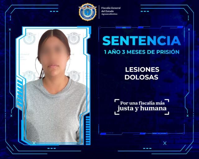 AGUASCALIENTES, AGS.- La Fiscalía General del Estado de Aguascalientes obtuvo una sentencia condenatoria en contra de una persona de sexo femenino por su responsabilidad penal en la comisión del delito de lesiones dolosas en agravio de una familia.