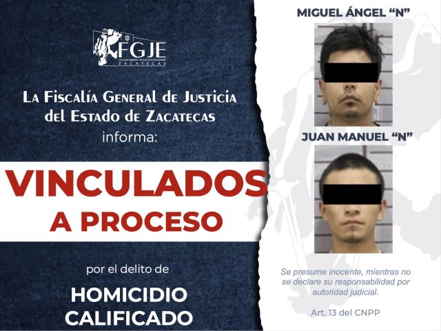 FRESNILLO, ZAC.- La Unidad de Homicidios Dolosos de la Vicefiscalía Distrital de Fresnillo logró la vinculación a proceso de Miguel Ángel “N” y Juan Manuel “N” por el delito de homicidio calificado en perjuicio de una persona, se dictó prisión preventiva y se establecieron cuatro meses de investigación complementaria.