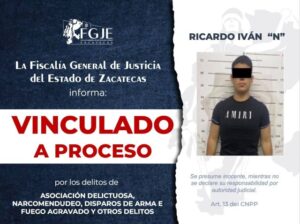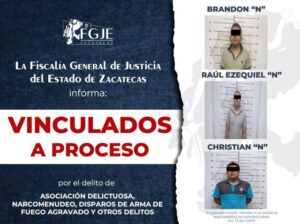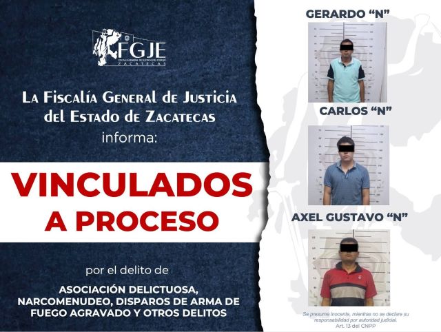 ZACATECAS, ZAC.- La Unidad de Investigación y Litigación logró la vinculación a proceso de Brandon “N”, Raúl Ezequiel “N”, Christian “N”, Gerardo “N”, Carlos Eduardo “N”, Axel Gustavo “N” y Ricardo Iván “N” por los delitos de contra la salud en su modalidad de narcomenudeo en la variante de posesión de metanfetamina con fines de comercio o suministro aun de manera gratuita, asociación delictuosa, atentados a la seguridad de la comunidad y disparo de arma de fuego agravado en agravio de la sociedad y elementos de la Policía Municipal de Guadalupe, Policía Metropolitana y Policía Estatal Preventiva, como medida cautelar se dictó prisión preventiva y se establecieron tres meses de investigación complementaria.