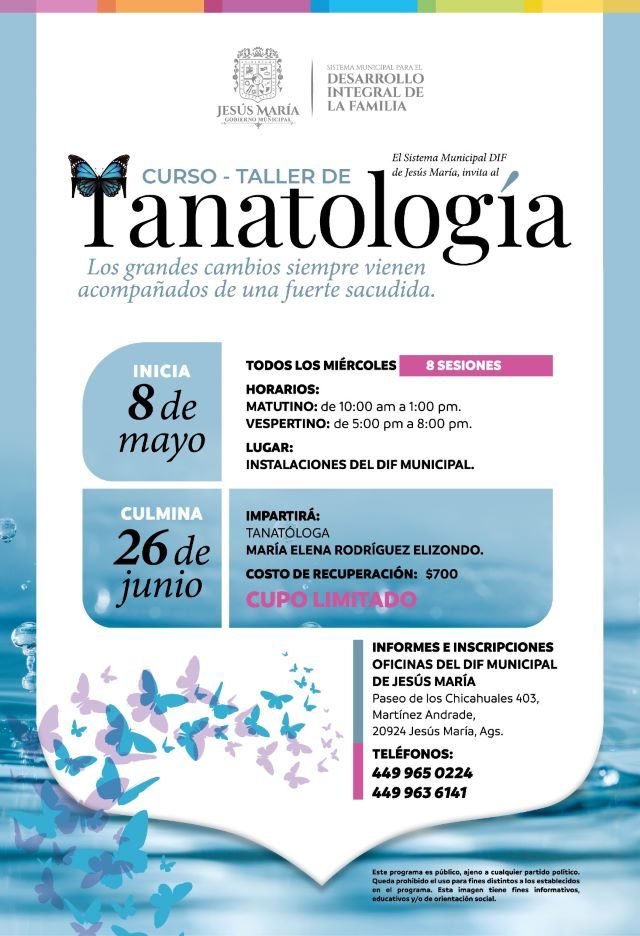JESÚS MARÍA, AGS.- El Gobierno de Jesús María, a través del DIF Municipal, invita a la ciudadanía en general a inscribirse al curso-taller de Tanatología, que se llevará a cabo del 8 de mayo al 26 de junio en las instalaciones del DIF Municipal, dentro del programa de salud mental que lleva a cabo la dependencia.