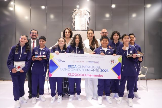 AGUASCALIENTES, AGS.- La gobernadora Tere Jiménez y la Fundación BBVA reconocieron el esfuerzo de los ocho estudiantes que obtuvieron los mejores promedios en la Olimpiada del Conocimiento Infantil Aguascalientes 2023, entre más de 25 mil 400 participantes; a ellos se les entregarán becas mensuales de 2 mil pesos, que recibirán durante los tres años que cursen la secundaria, estos apoyos podrán ampliarse a otros niveles académicos si continúan con un promedio mínimo de ocho, pudiendo llegar hasta la universidad.