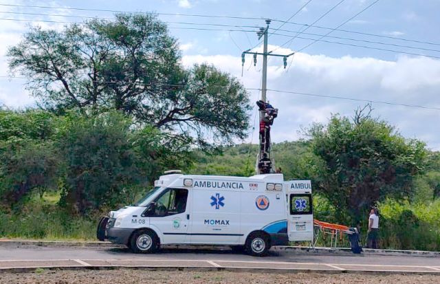 MOMAX, ZAC.- Un trabajador de una empresa de servicios de internet resultó lesionado de consideración tras sufrir una descarga eléctrica en lo alto de un poste, del que quedó suspendido por su arnés de seguridad.