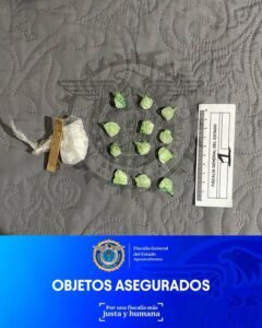 Durante la diligencia judicial fueron localizados y asegurados 12 envoltorios plásticos de color verde y 1 envoltorio de color transparente, los cuales contenían una sustancia granulada al tacto, presuntamente narcótico, misma que fue debidamente embalada y puesta a disposición del agente del Ministerio Público para su análisis pericial correspondiente.