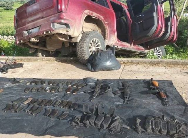 Dentro de la camioneta, que resultó con reporte de robo vigente, localizaron 3 fusiles de asalto, 1,450 cartuchos útiles, 52 cargadores y 112 artefactos poncha llantas.