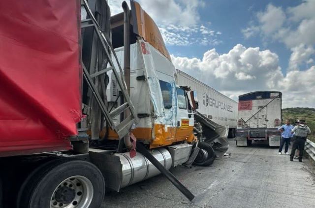 GUADALUPE, ZAC.- Tres camiones de carga quinta rueda chocaron entre sí en esta cabecera municipal, por lo que los conductores resultaron lesionados, aunque no fue necesario trasladarlos a ningún hospital.